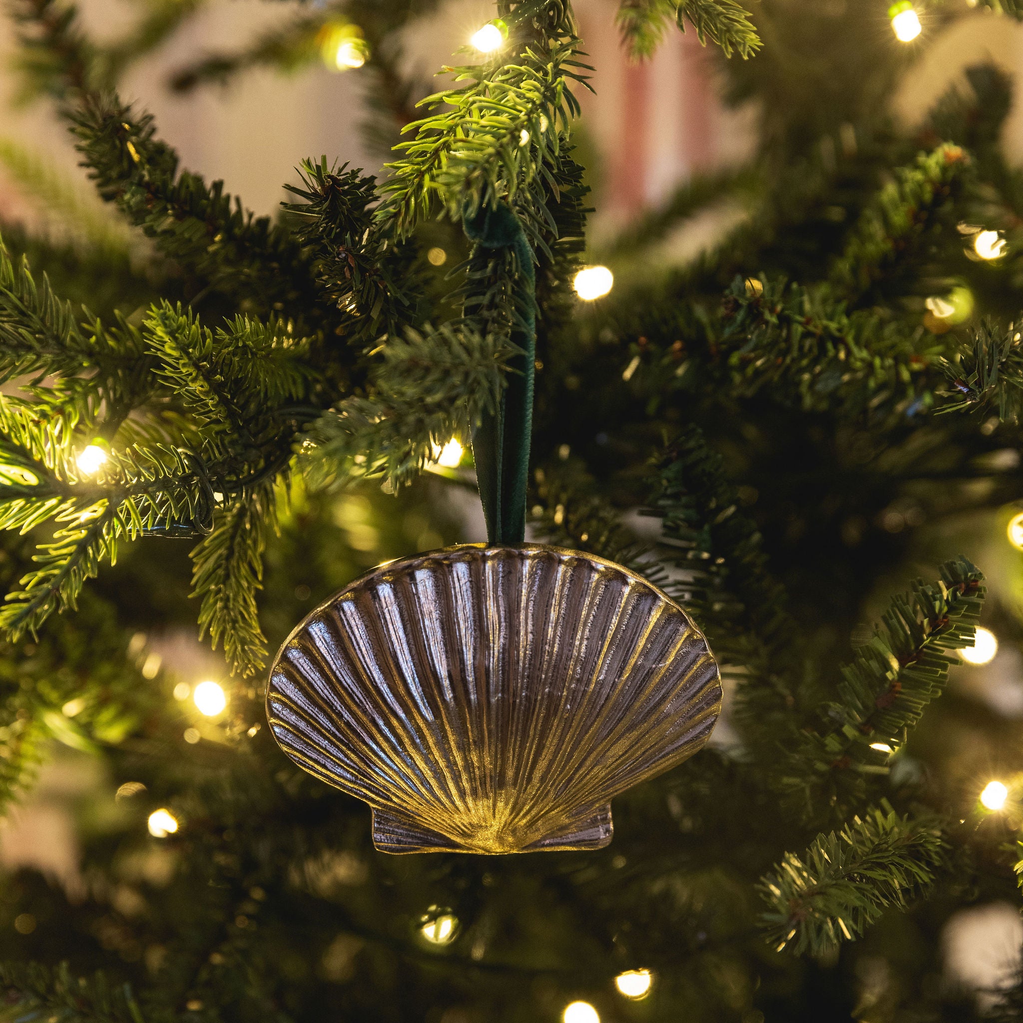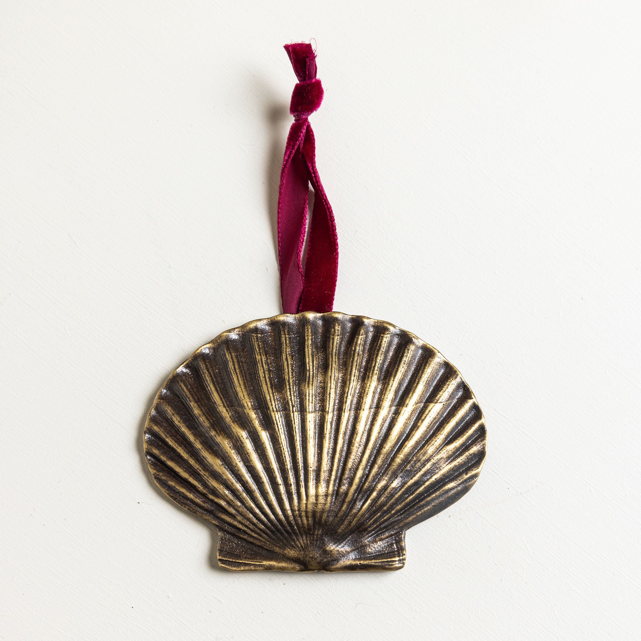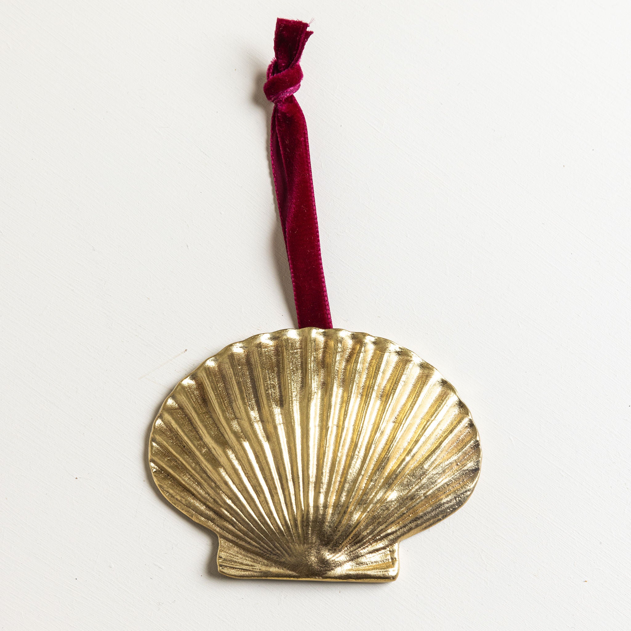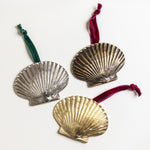 A homage to our signature shell collection. This detailed scallop design is cast in solid brass and contrasted with a soft velvet ribbon. A year-round piece that brings coastal elegance to the holiday tree. Available in polished chrome, antique brass, and lacquered brass finishes.